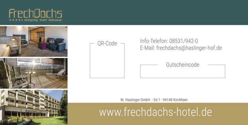 ist für alle Leistungen im Hotel FrechDachs einlösbar. Alternativ kann der Gutschein in den weiteren Haslinger Hotels in Kirchham und Bad Füssing - Haslinger Hof und Hotel Promenade - eingelöst werden.