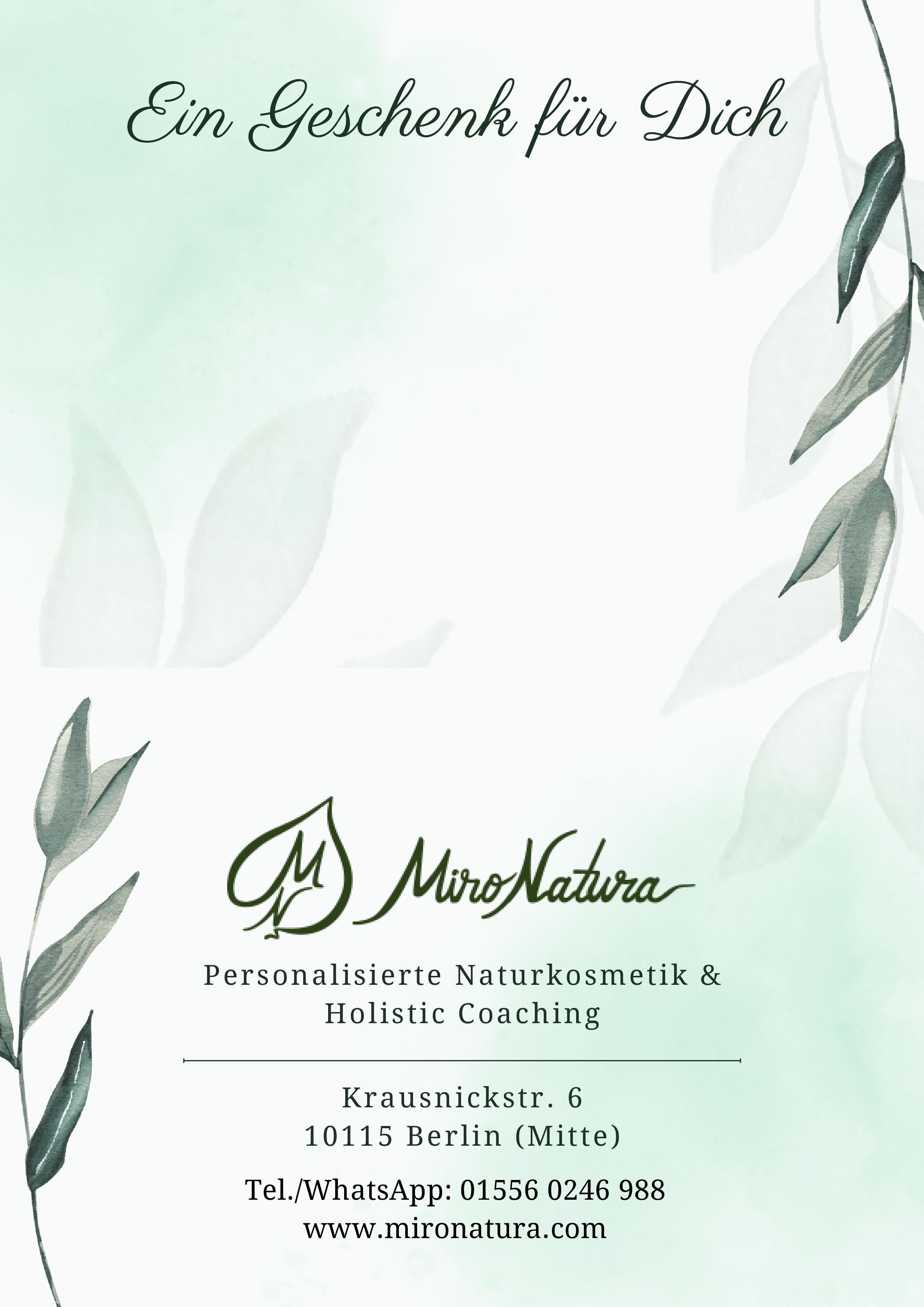 Der Geschenkgutschein gilt für alle Leistungen bei MiroNatura. Er ist innerhalb eines Jahres ab dem Kaufdatum direkt im Studio einzulösen. Und so funktioniert es: