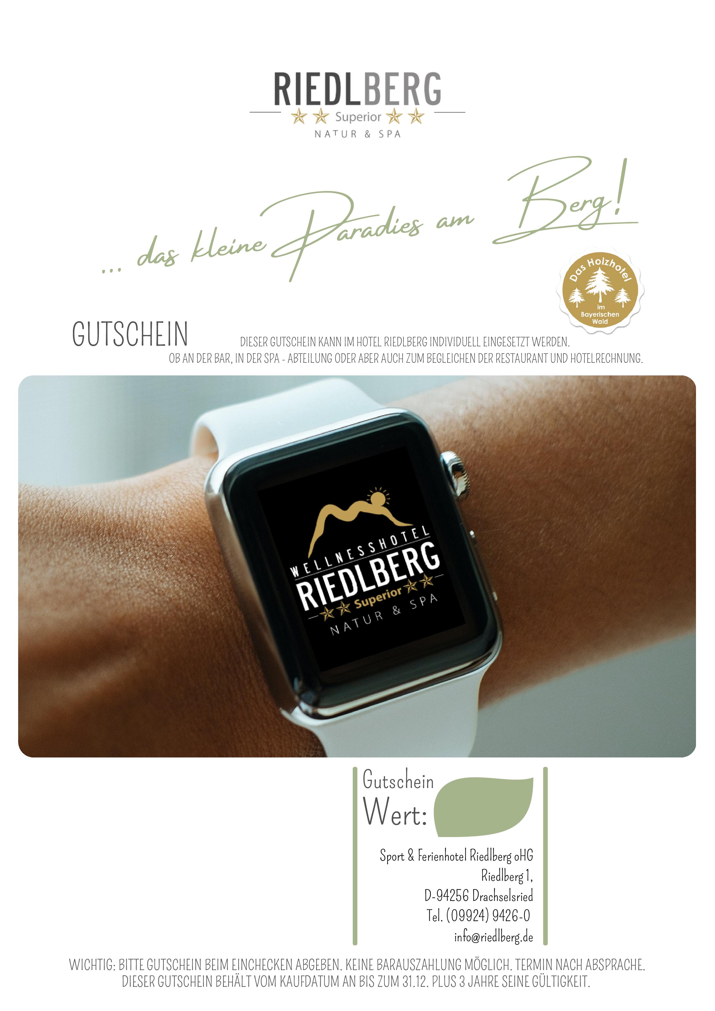 Dieser Gutschein kann im Hotel Riedlberg individuell eingesetzt werden. Ob an der Bar, in der Spa - Abteilung oder aber auch zum Begleichen der Restaurant und Hotelrechnung.