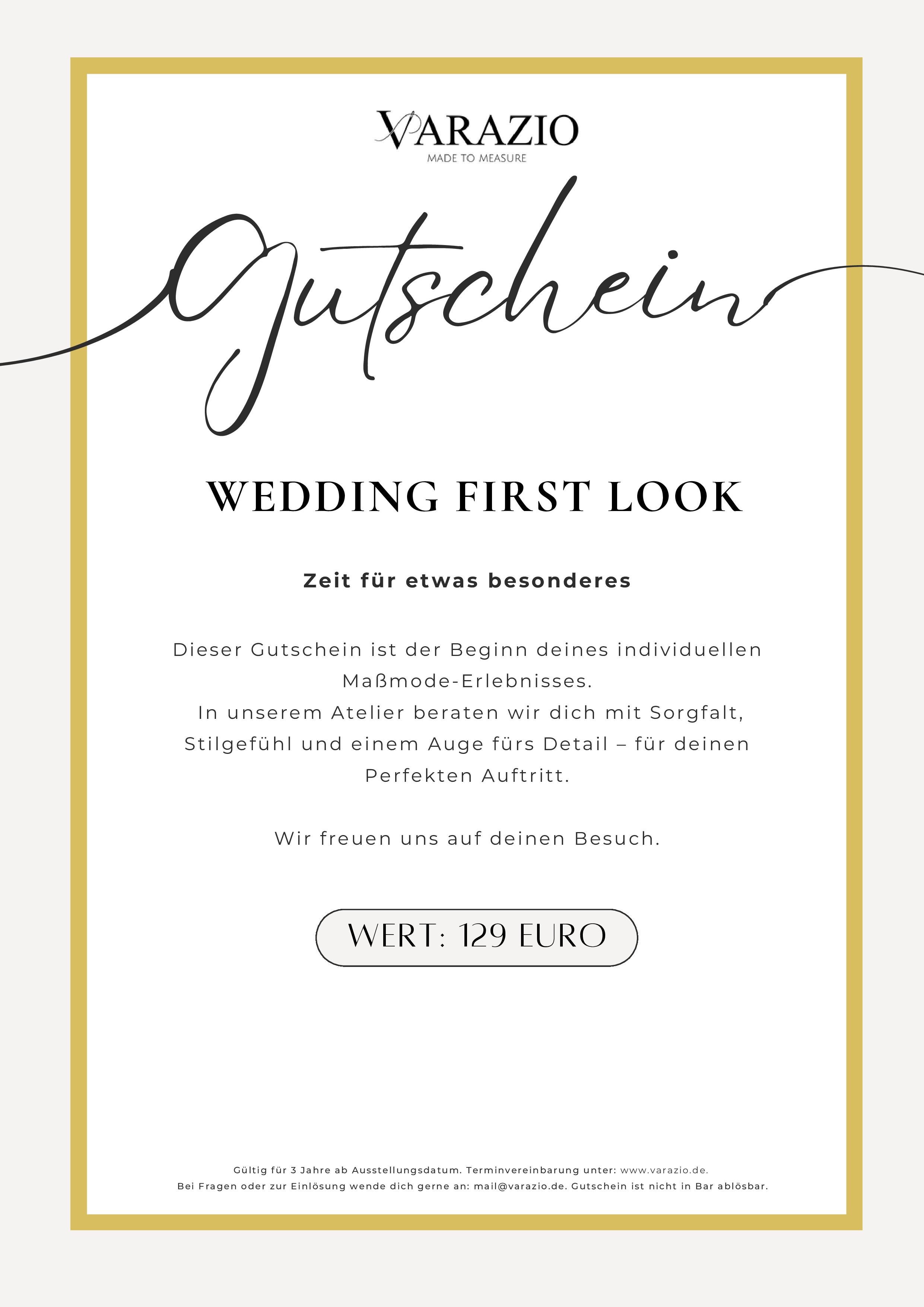Dieser Gutschein beinhaltet ein persönliches Kennenlernen in entspannter Atmosphäre – inklusive guter Drinks und Raum für alle Fragen rund um den Hochzeitsanzug.